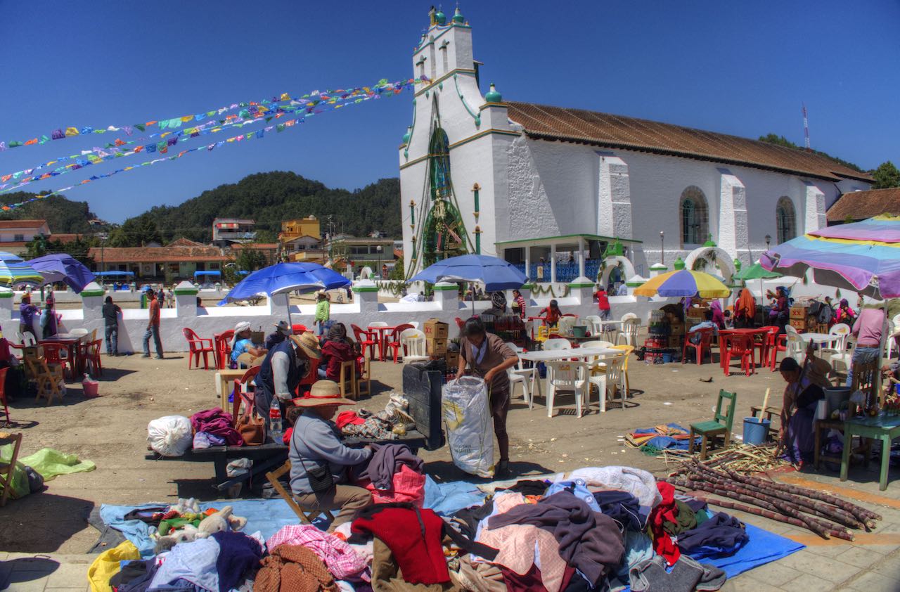 Eine meiner Touren führte mich zur Kirche San Juan Chamula. Diese Kirche verteidigt ihre Maya Herkunft die mit katholischen Glauben gemischt wurde. so findet man hier Grass auf dem Boden, keine Bänke, eine Menge Kirchengänger die am Boden vor Kerzen knien und nicht zuletzt Hühner die geopfert werden.
