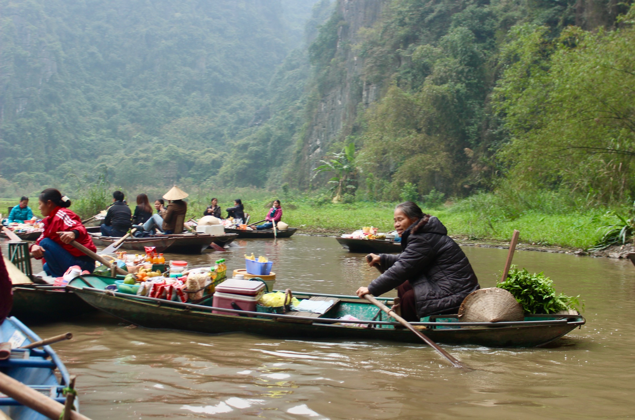 Jedes Boot darf maximal von zwei Touristen oder vier Einheimische besetzt werden (?) und natürlich einem Bootsführer, der die gesamte Distanz rudert. Auch für die Vietnamesen ist dies ein Ausflugsziel, weshalb sehr viele Einheimische die Tour mitgemacht haben. Eine Tour dauert zwei Stunden. Der Ruderer hat eine Ordentliche Leistung vollbracht, da er nicht müde wurde und die gesamte Strecke durchgestrampelt ist. Für etwa 2,50€ pro Person war die Tour wirklich sehr günstig.